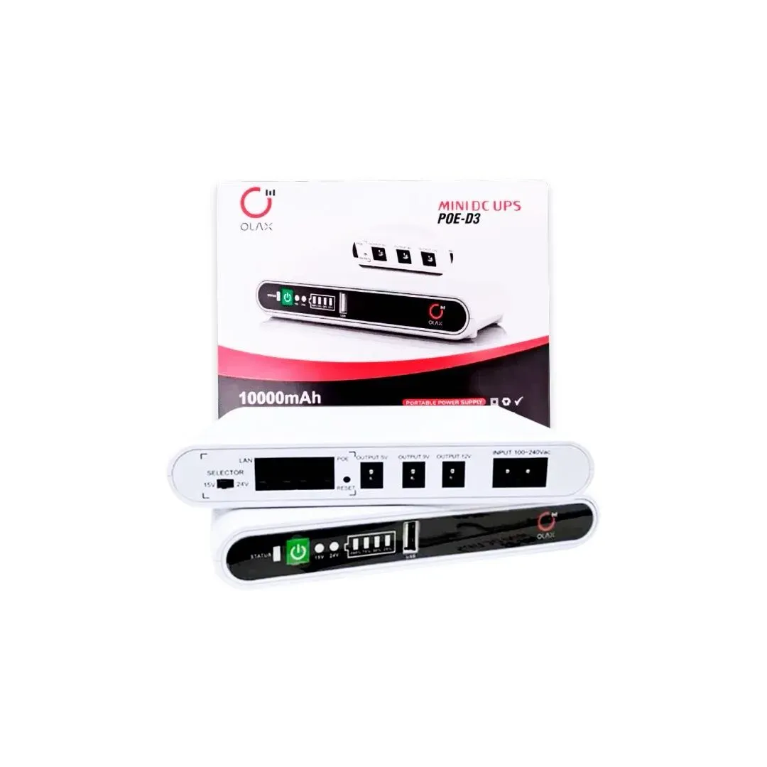 El MINI UPS OLAX de 10000mAh es la solución perfecta para mantener tus dispositivos electrónicos cargados en todo momento. Con su capacidad de 10000mAh, este UPS portátil garantiza que nunca te quedes sin batería, ideal para uso en casa o en movimiento.